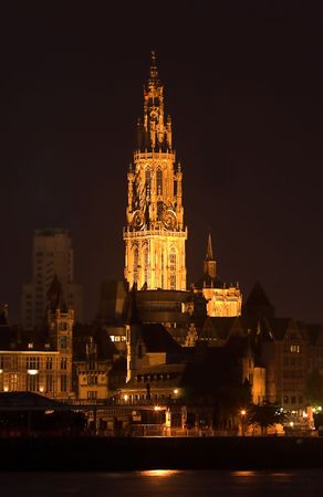 Antwerp cathedral at night, alongside the river Scheldt