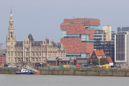 Editorial: ANTWERP, BELGIUM, August 26, 2017 - The Antwerp pilot building with the Museum by the River in the background, seen from the left bank of the Scheldt