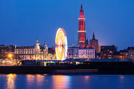 Night view over illuminated city of Antwerp, Belgium