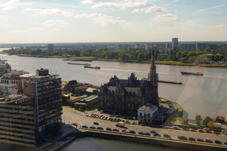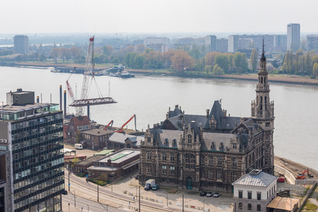 Antwerp, Belgium - June 16, 2017: Cityscape of a port of Antwerp in Belgium over the river.