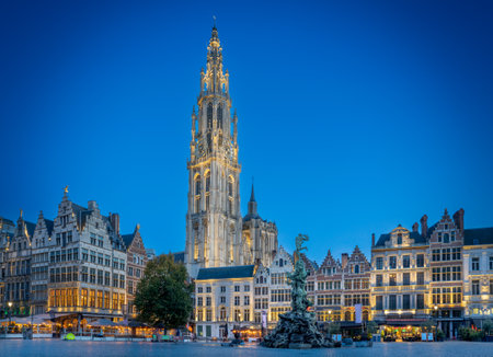 Grote Markt, the central square of Antwerp, Belgium, captured during the blue hour. The historic guildhalls and the city hall are illuminated against the deep blue evening sky, reflecting the charm and grandeur of this European landmark.