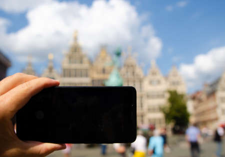 Antwerp, Flanders, Belgium. August 2019. In the town hall square, a smartphone frames the magnificent Renaissance buildings: the display is black and the background blurred.
