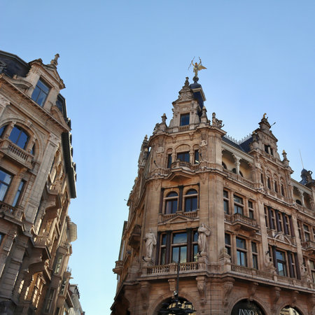 Ornate building facade showing historical architecture with classical statues and a golden rooftop sculpture under a clear blue sky. Antwerp, Belgium