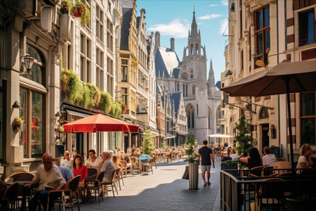 Old street with tables of cafe in Ghent (Gent), Belgium. Architecture and landmark of Ghent. Cozy cityscape of Ghent.