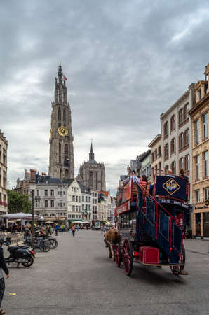 ANTWERP, BELGIUM - AUGUST 22, 2013: Tourists in a horse-drawn carriage in the Grote Markt (Great Market Square) of Antwerp, Belgium