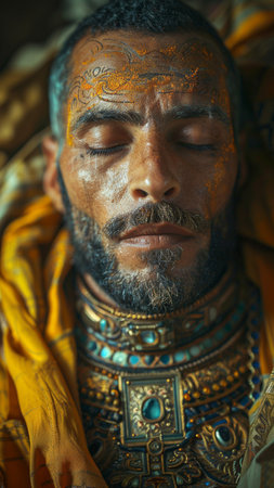 Close-up portrait of a confident Arab man wearing a traditional headscarf, showcasing striking facial features and a serene expression. The image captures cultural heritage and personal strength.