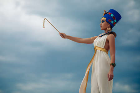 Young woman in image of ancient egyptian queen Nefertiti stands against background of blue sky with whip in her hand.