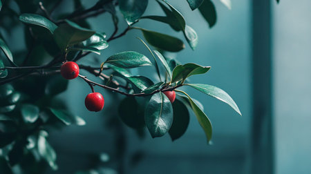 A branch of a tree with red berries on it. The leaves are green and the berries are shiny