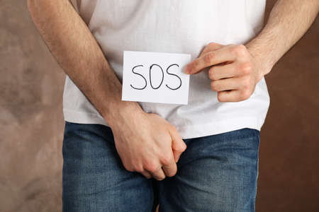Man holds his crotch and inscription Sos on brown background, close up