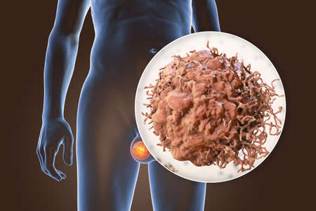 Testicular cancer, medical 3D illustration showing malignant tumor in the testis and close-up view of testicular cancer cell