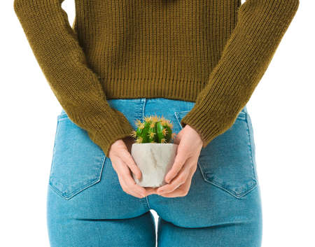Young woman with cactus on white background. Hemorrhoids concept