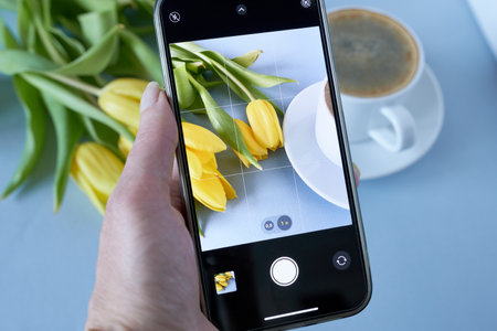 A woman holds a phone in her hand with a picture of tulips on the screen.