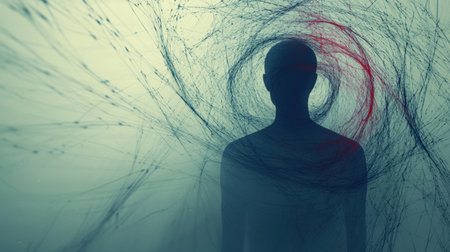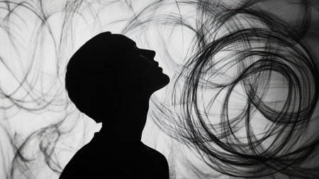 A human silhouette stands amidst a swirling pattern of lines and dots, symbolizing emotions of loneliness and despair in a quiet atmosphere.