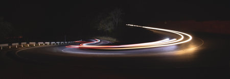 Cars light trails on a winding road at night. Long exposure image of a highway in the dark
