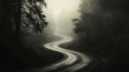 Misty forest with winding road, atmospheric landscape. Mystery and tranquility concept
