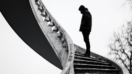 A solitary figure in a dark hooded jacket stands with head bowed, hands in pockets, on a curved, weathered stone staircase featuring ornate balustrade and snow-dusted steps.