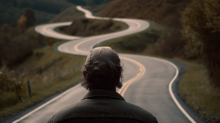 Winding road through dark forest at dawn, mysterious travel journey concept