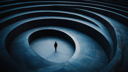 A man is standing in the middle of a large, circular room. The room is dark and empty, with only the man visible. Scene is somber and lonely, as the man is alone in the vast space
