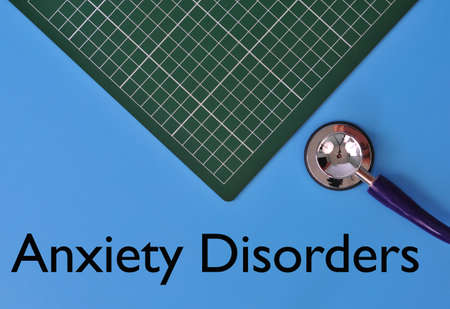 Layout of Stethoscope and graph pad with the text ANXIETY DISORDER on blue background