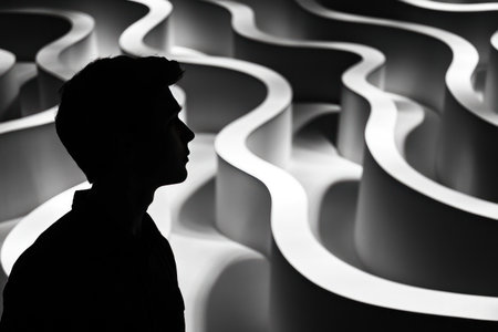 A black and white photograph of the silhouette of an adult man standing in front of an abstract maze made from smooth lines, with light casting soft shadows on his face. The background is a dark gray, creating contrast between the shadowed areas and highlights on the shapes, adding depth to the composition. --ar 3:2 --v 6.1 Job ID: cea05af4-5001-47dc-92af-32f4c99edb27