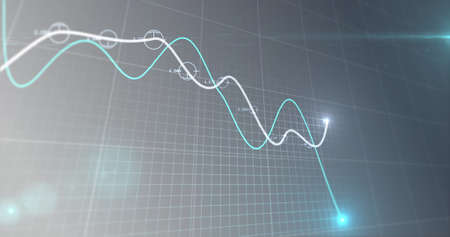 Image of financial data processing, two lines with glowing spot on grid. global business finance concept digitally generated image.