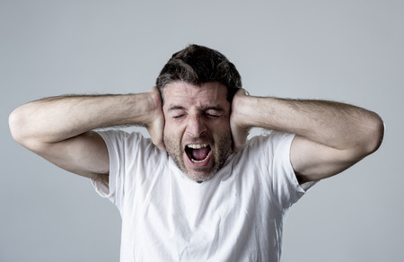 A young man with his hands on his ears, screaming and yelling in despair or frustration