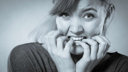 Frustration mental disorder psychology fear stress concept. Nervous girl biting nails. Stressed young blonde lady chewing off her fingers.