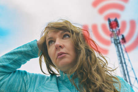 The woman is holding her head near the BTS. Harmful radiation from cellular 5G network transmitters concept
