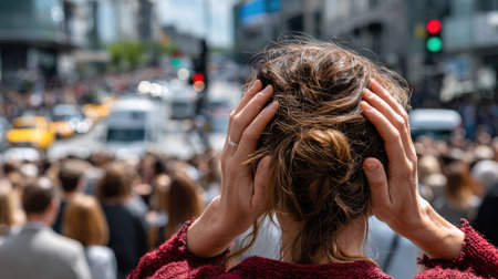 A woman is seen in a moment of distress, gripping her head in her hands while surrounded by the noise of a busy city street. This image powerfully illustrates the struggle with anxiety and panic attacks in the context of urban life, underscoring the need for compassion and understanding in our communities.