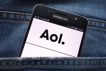 KONSKIE, POLAND - MAY 17, 2018: AOL website is displayed on Samsung smartphone hidden in jeans pocket