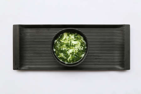 Wasabi in black saucer on wooden table with depth of field effect, Japanese food's condiment, bokeh background