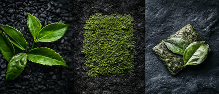 Exploring the delicate textures of green tea leaves and matcha powder on dark stone