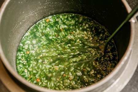 Glass with herbal drink of moringa leaves, top view. Healthy eating. Green leaves have medicinal properties.