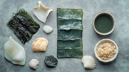 An artistic flat lay featuring various types of seaweed and shells on a textured surface, showcasing fresh and organic ingredients perfect for culinary use and decoration.