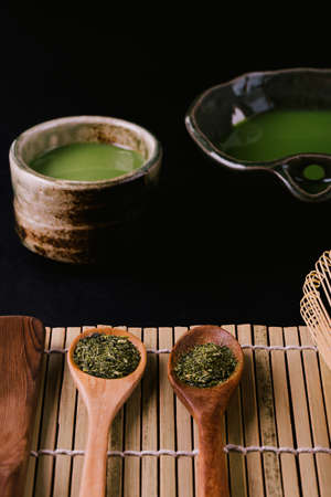 Matcha tea. Tea ceremony with dry powder and hot drink