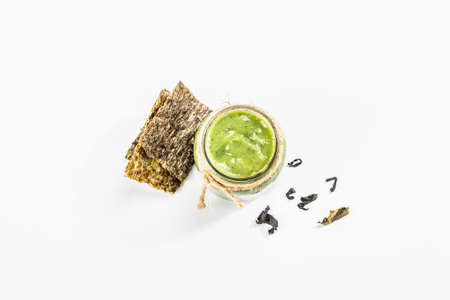 Jarred Kelp puree isolated on white background. Healthy superfood from oceanic seaweed. Ingredient for smoothies, soups, sauces, and dips. Flat lay, mockup, template, top view