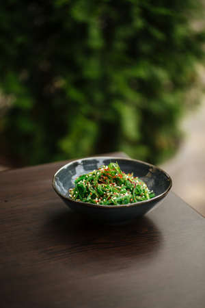 Green chuka seaweed salad in a black bowl on the wooden table with blurry background