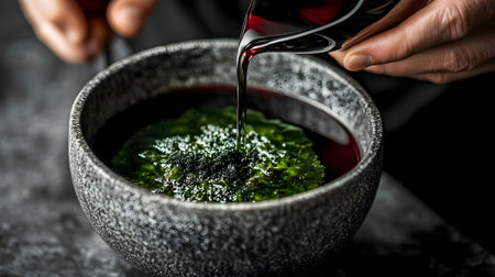 Dark broth being poured over fresh seaweed in a textured stone bowl, creating a rich and umami-filled Japanese-inspired dish