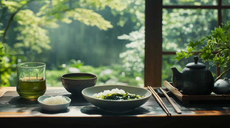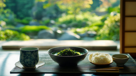 A serene dining setup with a bowl of seaweed soup, a cup of green tea, and a simple plate of rice, set against a backdrop of a tranquil garden view.
