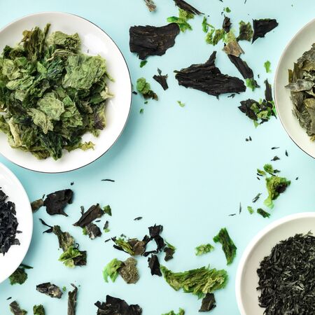Various dry seaweed, sea vegetables, square overhead shot on a teal background forming a frame with a place for text