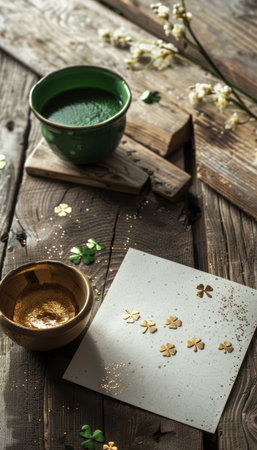 Elegant St. Patricks Day Card Design with Shamrocks and Gold Accents on Rustic Wooden Table