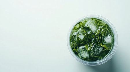 A serene close-up of green tea in a ceramic bowl surrounded by vibrant green leaves, creating a natural and refreshing atmosphere. Perfect for wellness and relaxation themes.