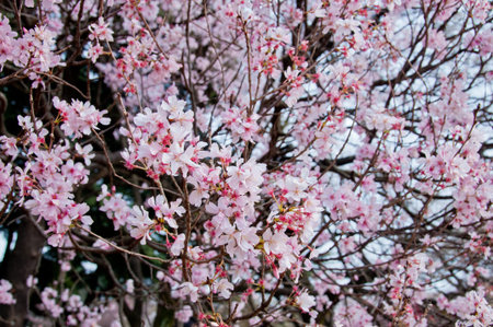 Beautiful pink cherry trees blooming extravagantly a nature scene. Spring scenery of Japanese countryside with amazing sakura blossoms branch at park of Tokyo.