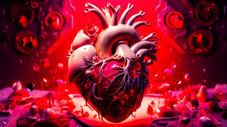 Artistic representation of the heart's anatomy, including blood and veins, created with Generative AI