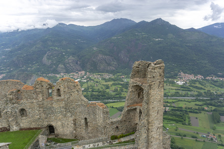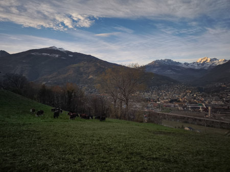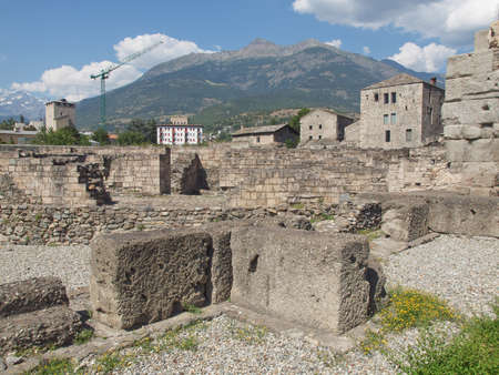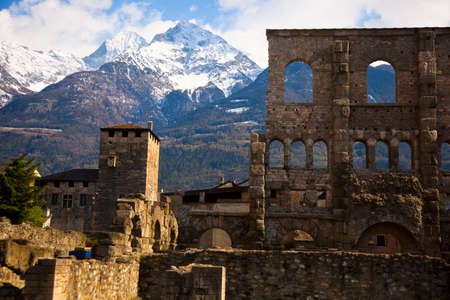 Landscape view of the beautiful mountains in Valle d'Aosta. Teatro Romano - Aosta, Valle d'Aosta, Italy