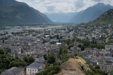 Aerial view of the old town of Sion city from the Tourbillon castle on a sunny day, canton of Valais, Switzerland
