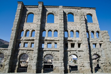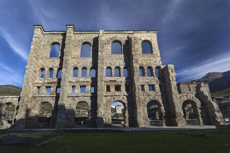 AOSTA, ITALY-JUNE 17,2019: The roman theather of Aosta is of roman period with a facade pierced by arches and windows 22 meters high