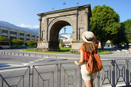 Tourism in Italy. Back view of tourist girl looking the Arch of Augustus in Aosta, Italy.