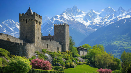 The medieval castle stands proudly amidst lush greenery and colorful flowers, with towering snow-capped mountains forming a stunning backdrop under a clear blue sky.