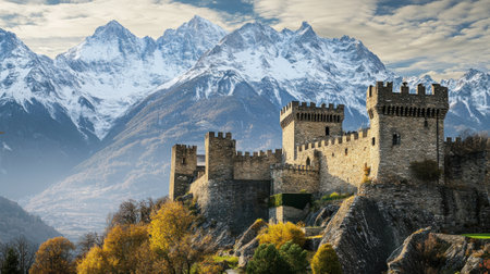 The ancient castle stands proudly on a hilltop, surrounded by vibrant autumn foliage, with golden sunlight casting shadows over the mountains and valleys below.